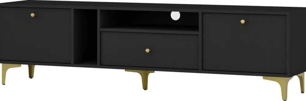 Szafka RTV o długości 180 cm wyróżnia się minimalistycznym, a zarazem eleganckim wyglądem. Drzwi po prawej i lewej stronie zapewniają dużą przestrzeń do przechowywania, idealną do ukrycia sprzętu audio-wideo, książek czy innych niezbędnych przedmiotów. W środkowej części szafki znajduje się szuflada, która jest idealna do przechowywania drobnych akcesoriów, takich jak piloty czy kable, oraz otwarta półka, doskonała na sprzęt multimedialny, taki jak konsole do gier czy odtwarzacze DVD.