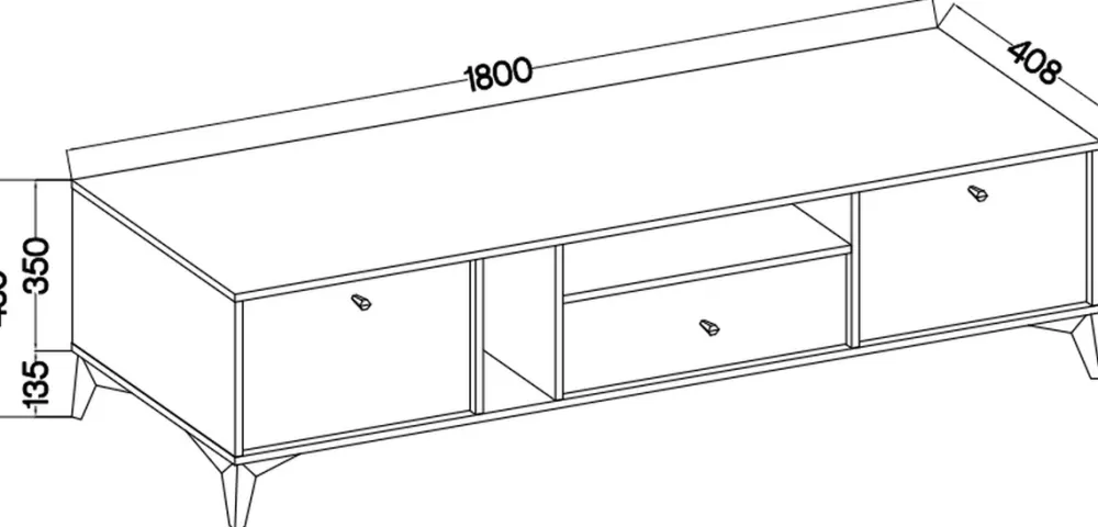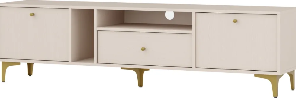 Szafka RTV o długości 180 cm wyróżnia się minimalistycznym, a zarazem eleganckim wyglądem. Drzwi po prawej i lewej stronie zapewniają dużą przestrzeń do przechowywania, idealną do ukrycia sprzętu audio-wideo, książek czy innych niezbędnych przedmiotów. W środkowej części szafki znajduje się szuflada, która jest idealna do przechowywania drobnych akcesoriów, takich jak piloty czy kable, oraz otwarta półka, doskonała na sprzęt multimedialny, taki jak konsole do gier czy odtwarzacze DVD.