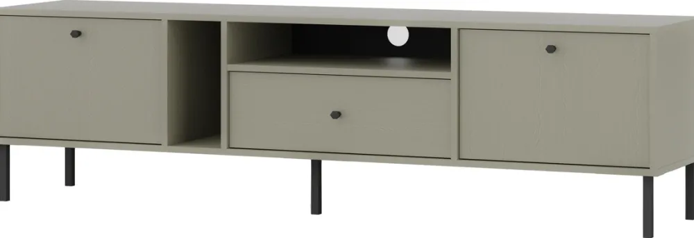 Szafka RTV o długości 180 cm została zaprojektowana z myślą o maksymalnym wykorzystaniu przestrzeni. Wyposażona w jedną pojemną szufladę oraz dwoje drzwi, oferuje dużo miejsca na przechowywanie niezbędnych akcesoriów RTV, jak piloty, kable czy kolekcje filmów i gier. Metalowe nóżki o wysokości 15 cm nadają meblowi nowoczesnego charakteru i zapewniają stabilność.