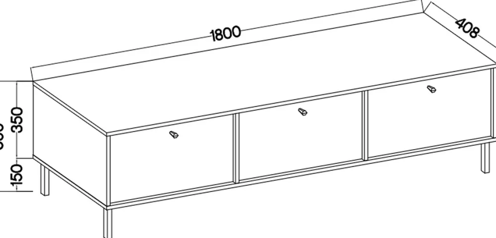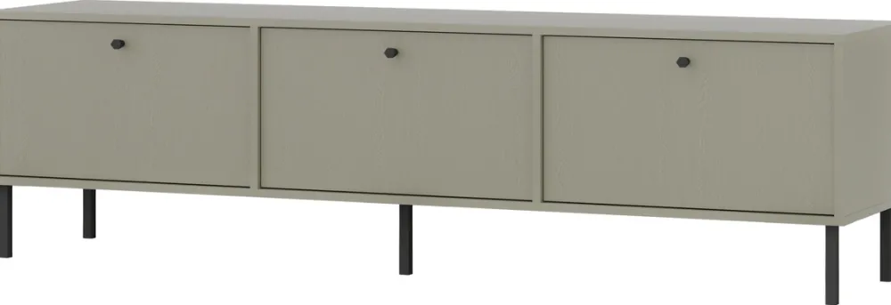 Szafka pod telewizor wyposażona jest w trzy drzwi, które umożliwiają łatwy dostęp do przechowywanych przedmiotów, jednocześnie dbając o porządek i harmonię w przestrzeni. Każde z drzwi posiada solidne, metalowe uchwyty, które nie tylko dodają industrialnego charakteru, ale również zapewniają trwałość i wygodę użytkowania.