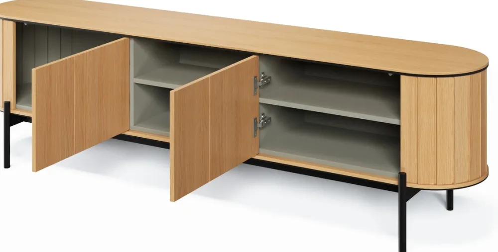 - Fronty szafki RTV otwierają się dzięki systemowi push to open, więc wystarczy jedno dotknięcie, żeby otworzyć szafkę RTV.