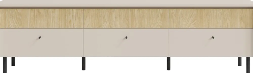 Szafka RTV MALIVO to stylowa propozycja do każdego nowoczesnego salonu. Jej elegancka bryła o szerokości 183,5 cm idealnie sprawdzi się jako baza pod telewizor, a pojemne szuflady pomogą uporządkować kable, piloty i inne akcesoria. Ciepła kolorystyka – połączenie beżu piaskowego z dębem olejowanym – wprowadza do wnętrza przytulność, a czarne, metalowe nóżki i uchwyty dodają jej nowoczesnego, loftowego charakteru.
