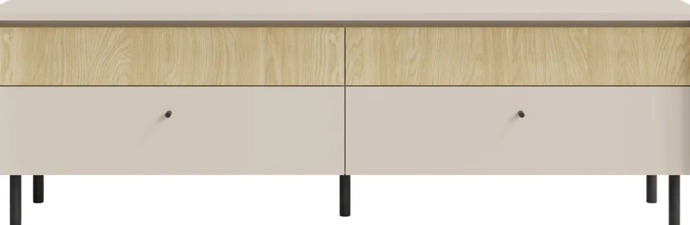 - Szafka RTV MALIVO 163,5 cm to nowoczesny mebel z 4 pojemnymi szufladami. Połączenie beżu piaskowego i dębu olejowanego ociepla wnętrze. Wykonana z laminowanej płyty, z obrzeżem ABS, na czarnych metalowych nóżkach. Idealna do eleganckiego salonu.