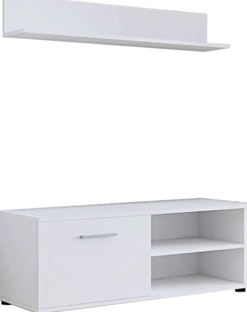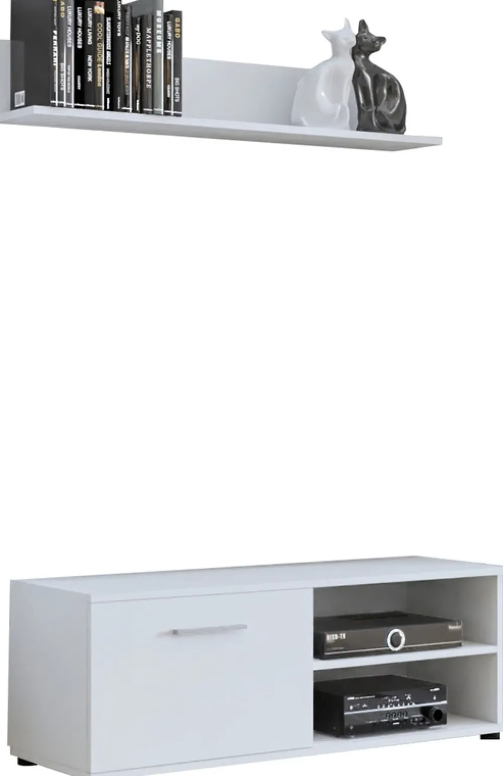 - Szafka pod telewizor ma 120 cm szerokości i posiada cztery wnęki do przechowywania, z czego dwie ukryte są za drzwiczkami uchylnymi. Dodatkowo w zestawie znajduje się półka na książki.
