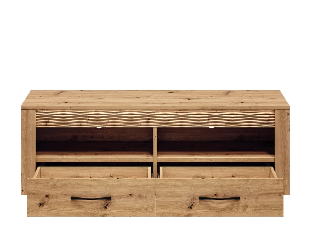 - Szafka RTV ARTIS 150 cm posiada dwie pojemne szuflady u dołu oraz dwie otwarte półki na rozmaite dekoracje oraz sprzęt RTV. Szafka posiada metalowe uchwyty w czarnym kolorze, oraz obrzeża wykończone okleiną ABS. Podświetlana wstawka LED.
