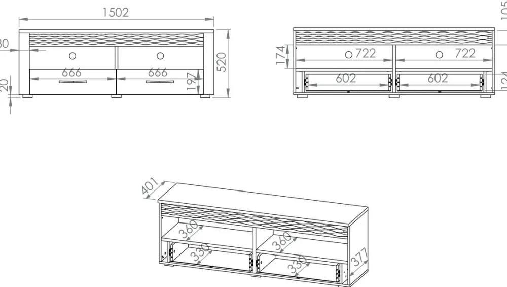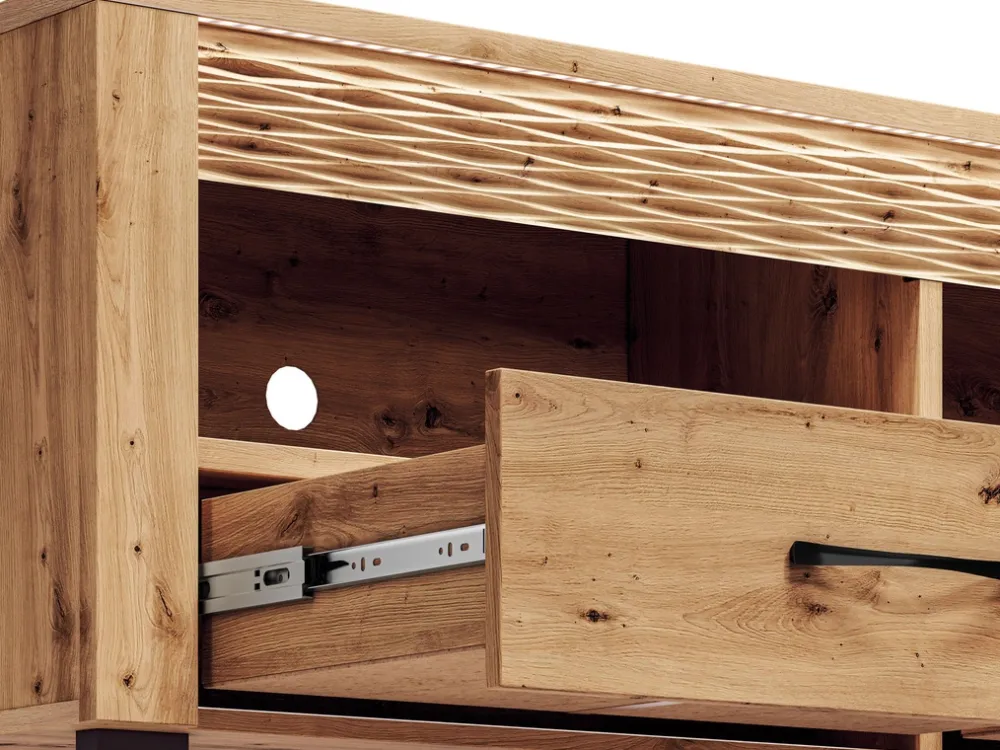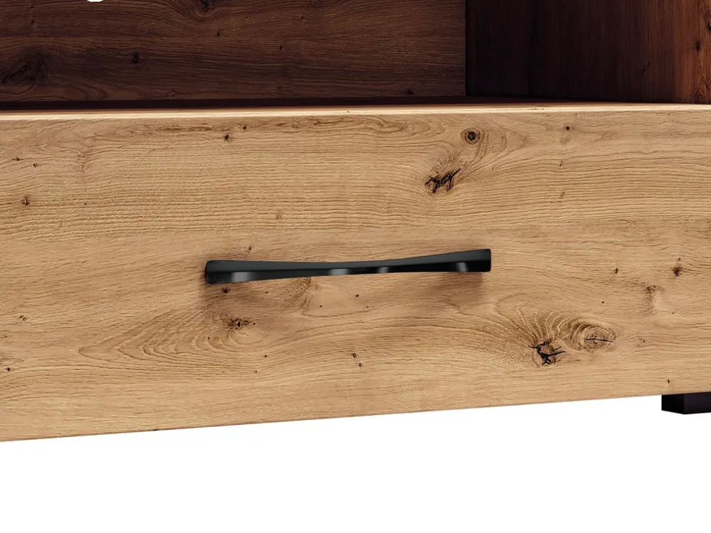 Nad szufladami znajdują się dwie półki, idealne do ustawienia dekodera, konsoli do gier lub innych urządzeń RTV. Dzięki przemyślanemu układowi półek, wszystkie niezbędne sprzęty są na wyciągnięcie ręki, a kable można łatwo ukryć, utrzymując porządek w salonie.