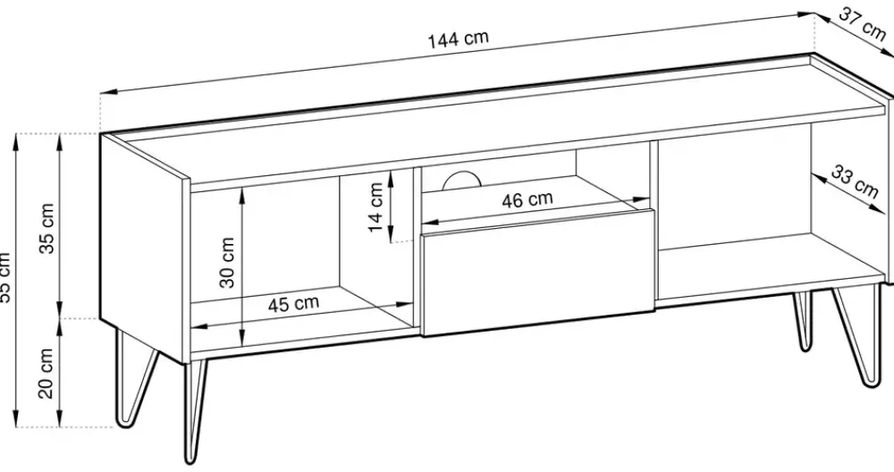 Nowoczesna szafka na wysokich nóżkach jest wyposażona w bezuchwytowy system otwierania, który gwarantuje płynne i łatwe otwieranie szuflady i drzwiczek. Szafka ma szerokość 144 cm, co czyni ją idealnym miejscem do umieszczenia telewizora każdej wielkości.