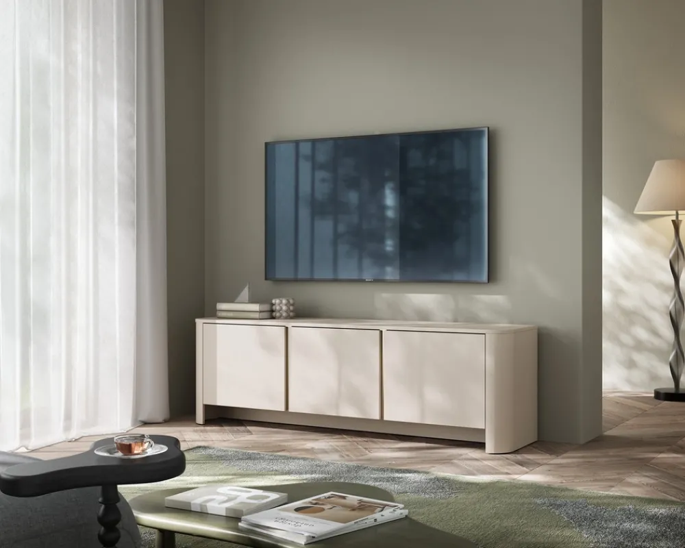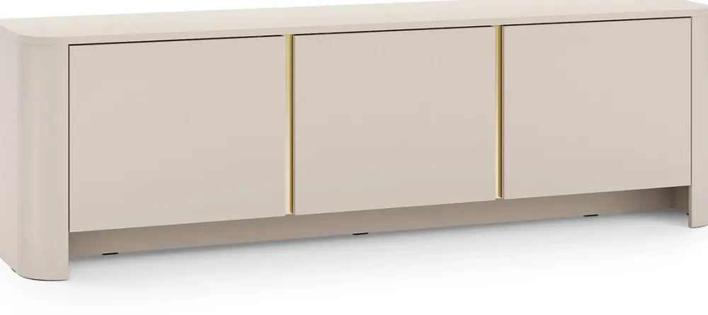 Szafka RTV z kolekcji BELVI to minimalistyczna forma i subtelna elegancja zamknięte w nowoczesnym odcieniu kaszmiru. Dzięki zaokrąglonym bokom i złotym akcentom mebel doskonale wpisuje się w styl premium, tworząc harmonijną przestrzeń w każdym salonie. Trzy zamknięte komory pomieszczą sprzęt i akcesoria, pomagając utrzymać porządek bez kompromisu w estetyce.