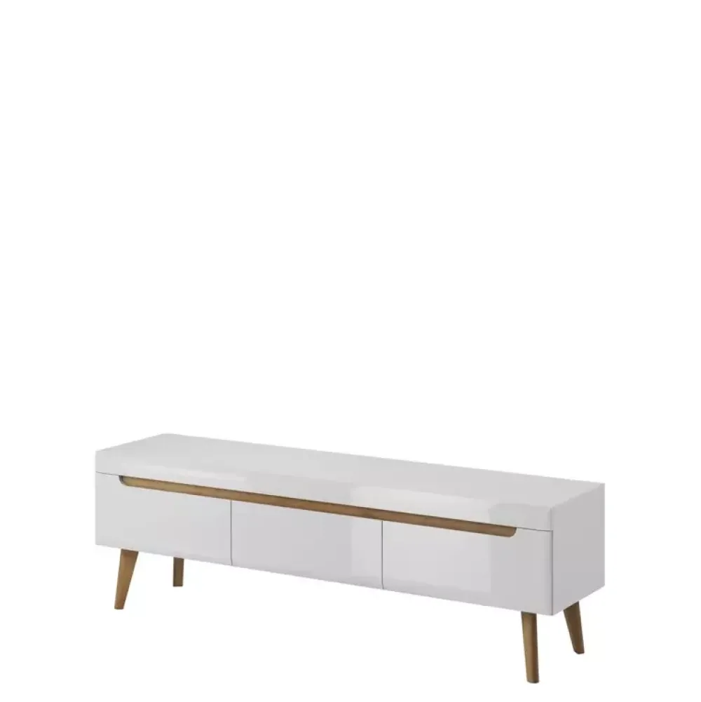 - Szafka RTV w stylu skandynawskim wyposażona w trzy szuflady pracujące na prowadnicach kulkowych z pełnym wysuwem. Szafka osadzona na drewnianych nóżkach barwionych na kolor dąb riviera.