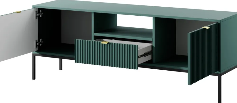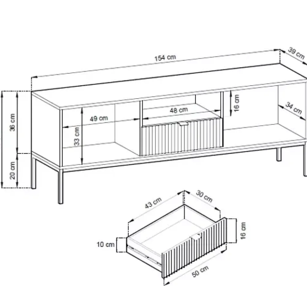 Szafka RTV pod telewizor wyposażona jest w drzwi po obu stronach, co zapewnia łatwy dostęp do przechowywanych przedmiotów. Dzięki temu rozwiązaniu możesz łatwo organizować i ukrywać różne akcesoria, od pilotów po gry i filmy. Szuflada umieszczona w centralnej części szafki jest idealna do przechowywania mniejszych przedmiotów, zapewniając porządek i łatwy dostęp.