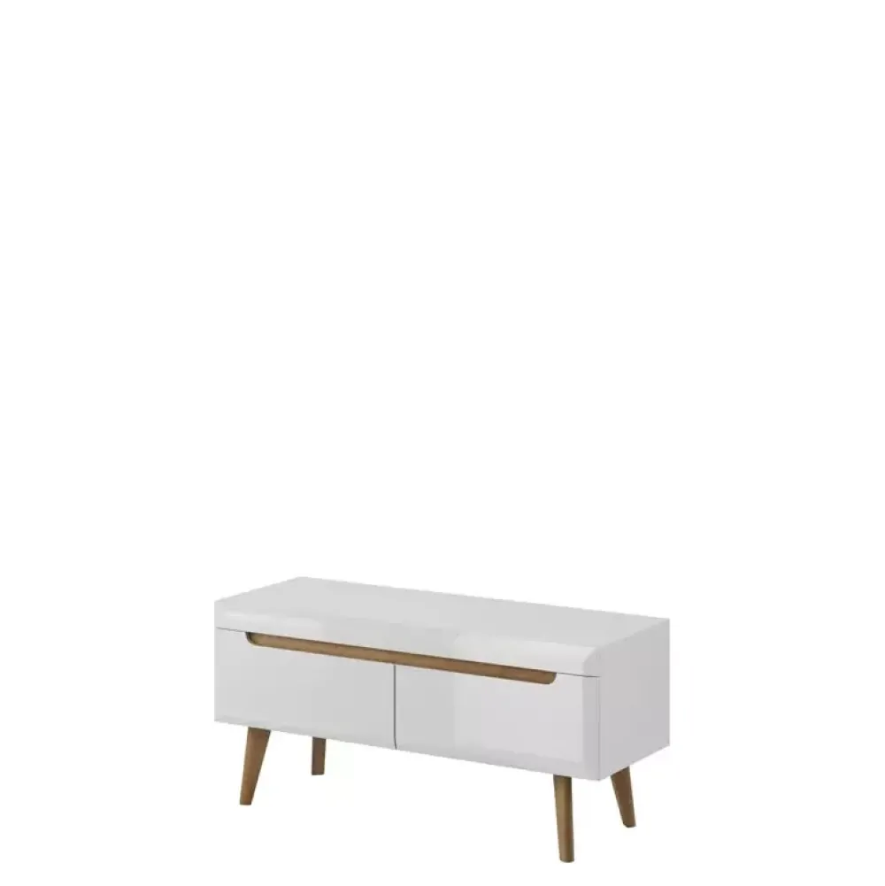 Szafka RTV w stylu skandynawskim wyposażona w dwie szuflady pracujące na prowadnicach kulkowych z pełnym wysuwem. Szafka osadzona na drewnianych nóżkach barwionych na kolor dąb riviera.