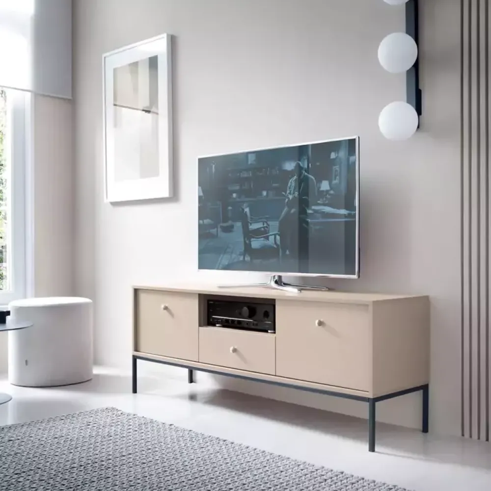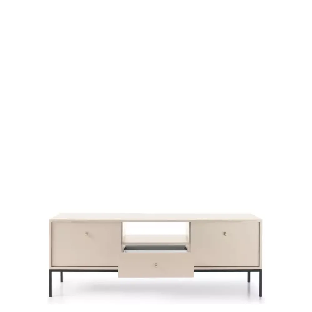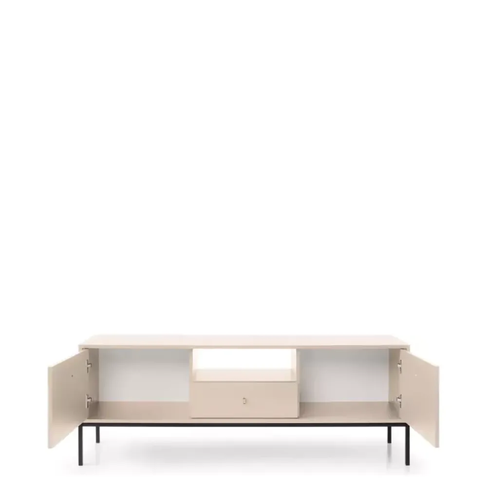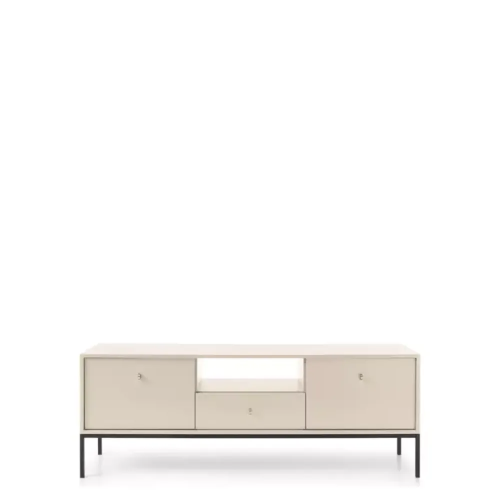 - Odśwież swój salon z naszą nowoczesną szafką RTV MONTI. Elegancka, beżowa szafka na czarnych metalowych nogach, z dwojgiem drzwi i centralną szufladą. Idealna dla współczesnych wnętrz.