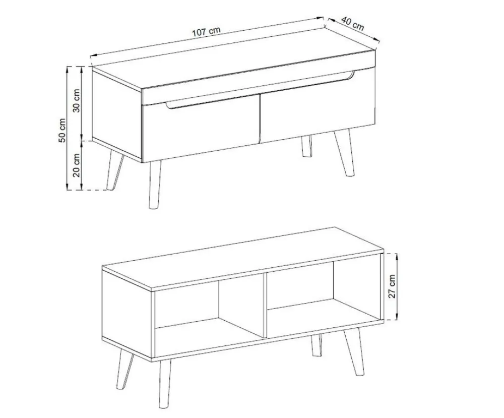 - Szafka RTV w stylu skandynawskim wyposażona w dwie szuflady pracujące na prowadnicach kulkowych z pełnym wysuwem. Szafka osadzona na drewnianych nóżkach barwionych na kolor czarny.