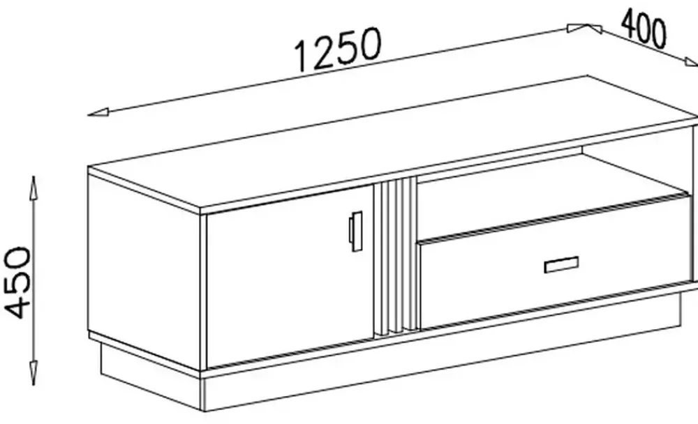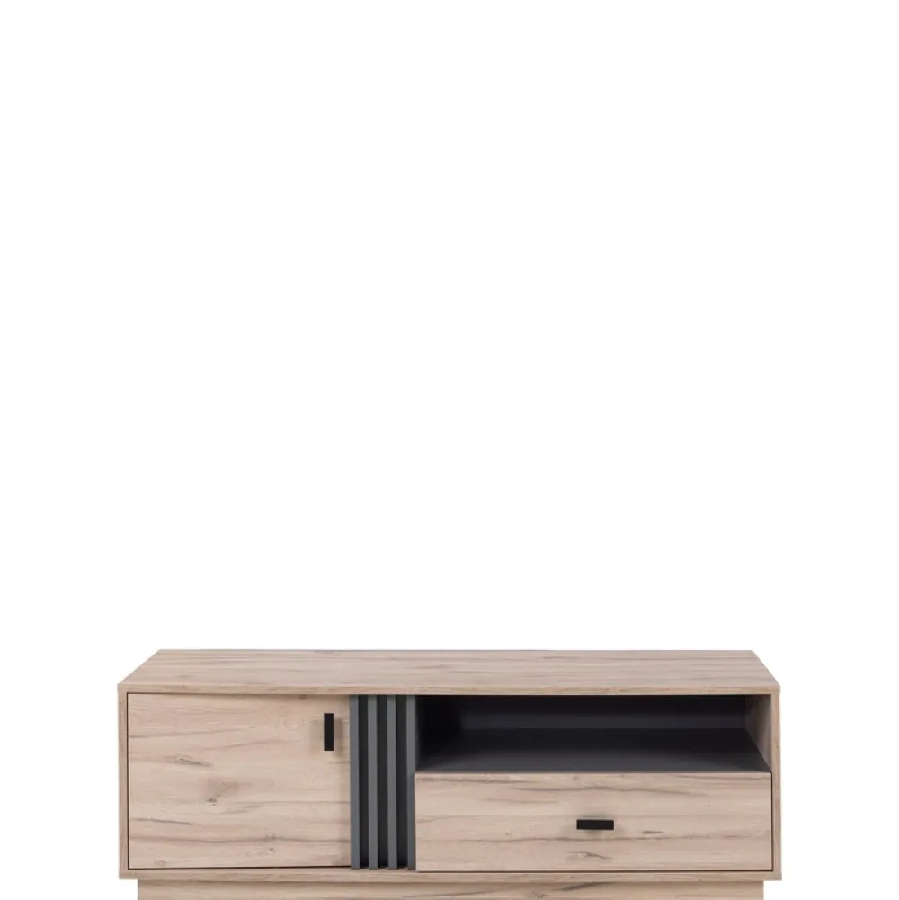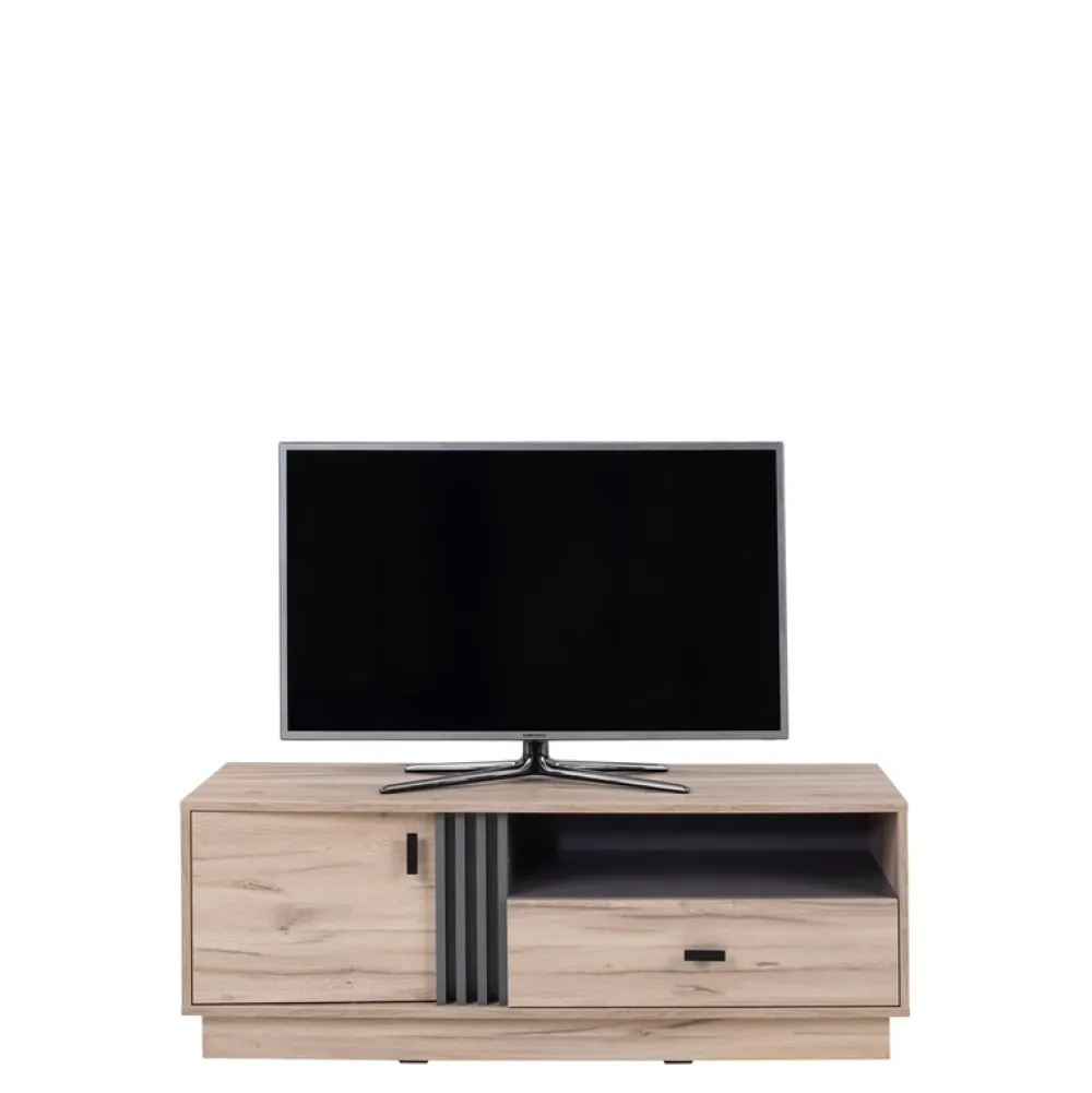 Szafka ma szerokość 125 cm, co sprawia, że jest idealnym rozwiązaniem zarówno do małych, jak i przestronnych salonów. Wyposażona jest w jedne drzwi oraz praktyczną szufladę, która zapewnia dodatkową przestrzeń do przechowywania. Nad szufladą znajduje się otwarta półka – idealne miejsce do umieszczenia dekodera, konsoli do gier czy innego sprzętu multimedialnego.