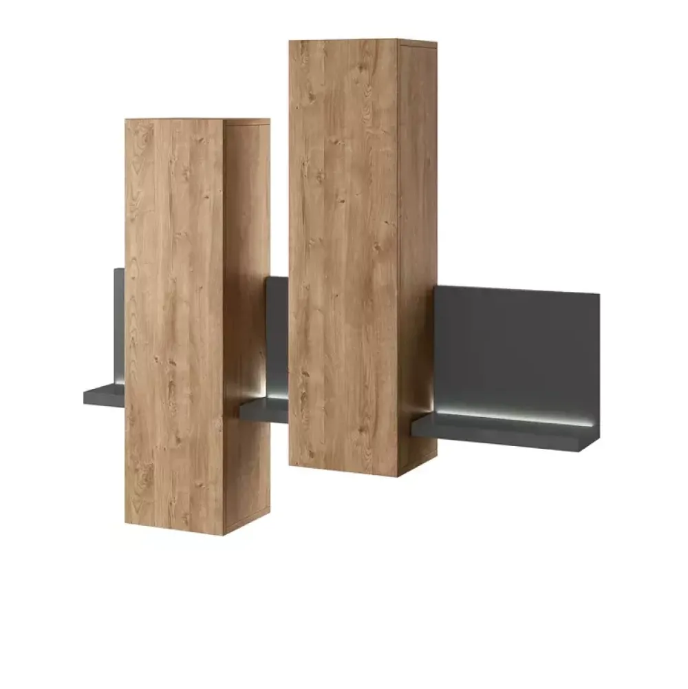 Asymetryczne szafki wiszące do salonu, osadzone na półce z oświetleniem led.