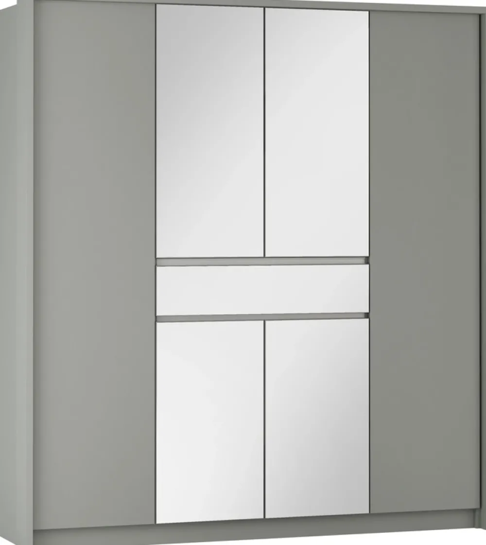 Centralna część szafy, ozdobiona dużym lustrem, kryje pięć półek, które idealnie sprawdzą się do przechowywania poskładanych ubrań, pościeli czy innych akcesoriów. Ich funkcjonalny układ pozwala na zachowanie porządku i łatwy dostęp do wszystkiego, co niezbędne na co dzień.