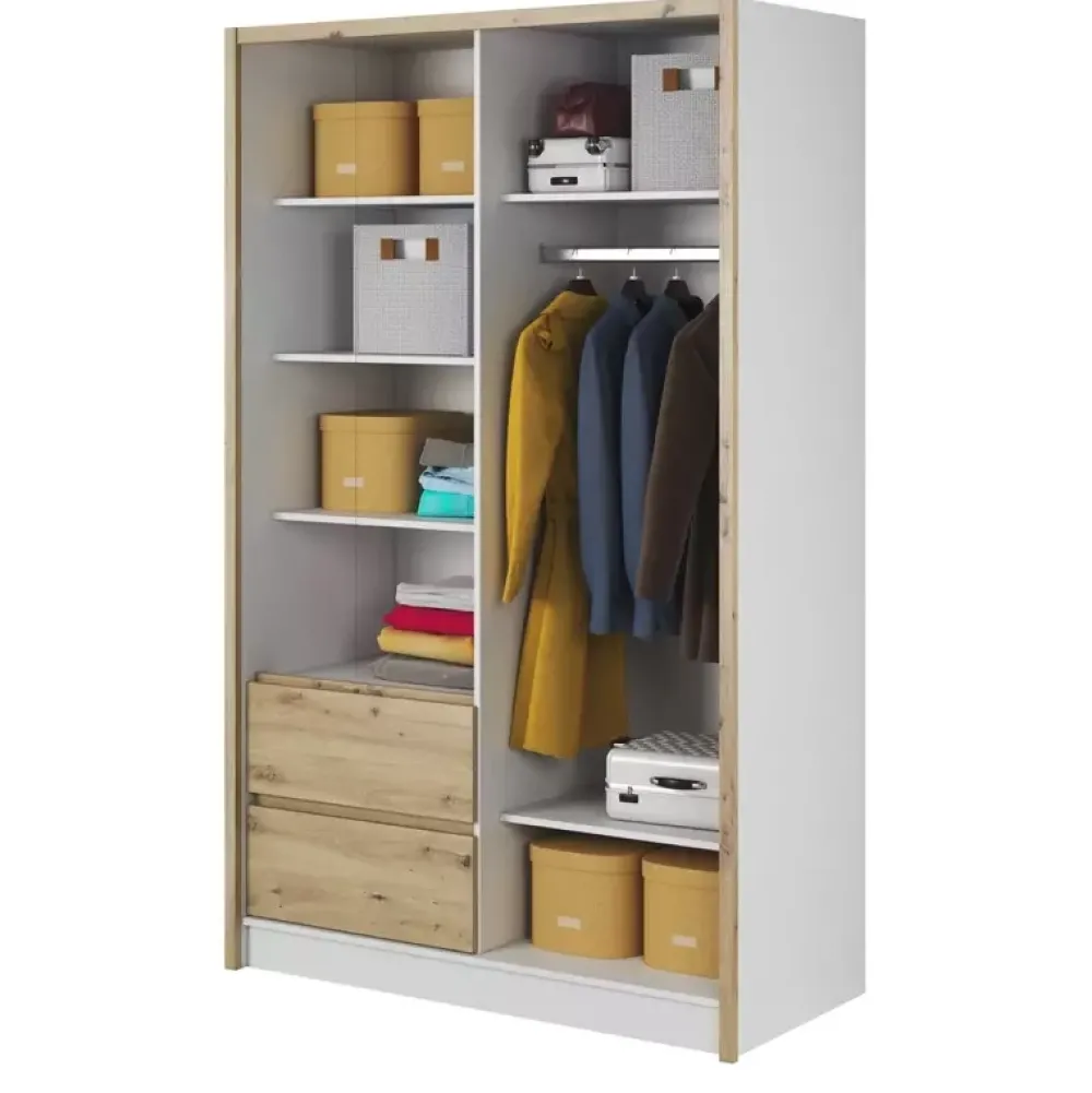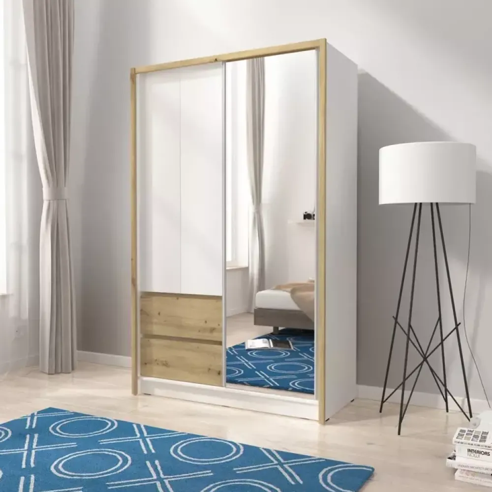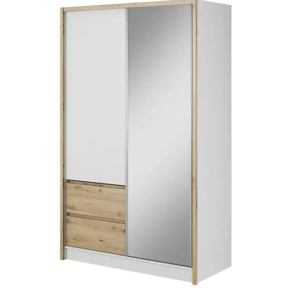 Połączenie trzech faktur w jednym modelu zachwyca designem, zobaczysz je w szafach w kolorystyce biały/dąb sonoma oraz biały/dąb artisan Jeśli jesteś zwolennikiem minimalizmu, szafa w wersji białej – bez dekoru drewna będzie dla Ciebie idealnym rozwiązaniem.