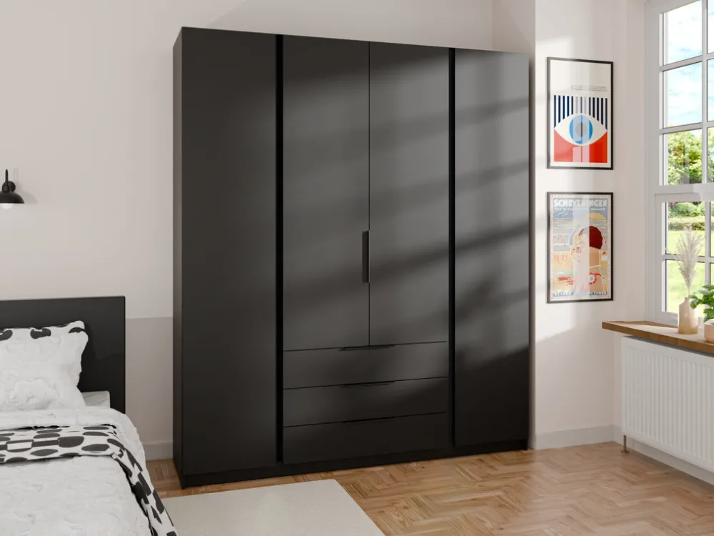 U dołu szafy umieszczone są trzy szuflady na prowadnicach kulkowych, które gwarantują łatwość i płynność użytkowania nawet przy ciężarze przechowywanych przedmiotów. Czarne, aluminiowe uchwyty dodają nowoczesnego charakteru i są przyjemne w dotyku, co podnosi komfort codziennego użytkowania.