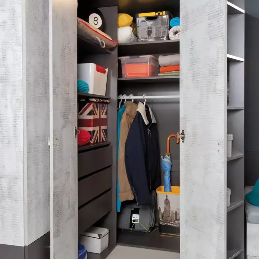 Ogromna szafa do pokoju młodzieżowego, w jej wnętrzu znajdziemy miejsce na wszystko, co chcielibyśmy schować przed oczami gości, są tutaj trzy pojemne szuflady, kilka dużych półek oraz szeroki drążek na wieszaki. Gdyby miejsca nadal było zbyt mało, jedną z zewnętrznych ścian zaaranżowano w czteropoziomowy regał, zaraz obok niego, znajduje się rząd aż siedmiu półek umieszczonych jedna nad drugą. Decydując się na taką szafę, nie ma mowy o wymówkach, porządek to obowiązek!