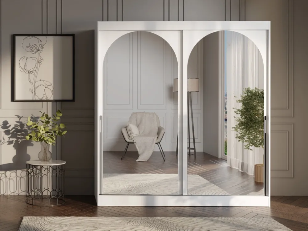 Szafa MORIN to propozycja dla tych, którzy cenią minimalistyczny design połączony z funkcjonalnością. Białe fronty z efektownymi lustrami o łukowym wykończeniu dodają wnętrzu przestronności i światła, a system przesuwny zapewnia wygodne użytkowanie nawet w mniejszych pomieszczeniach. Idealna do sypialni, garderoby czy przedpokoju – wszędzie tam, gdzie liczy się styl i porządek.