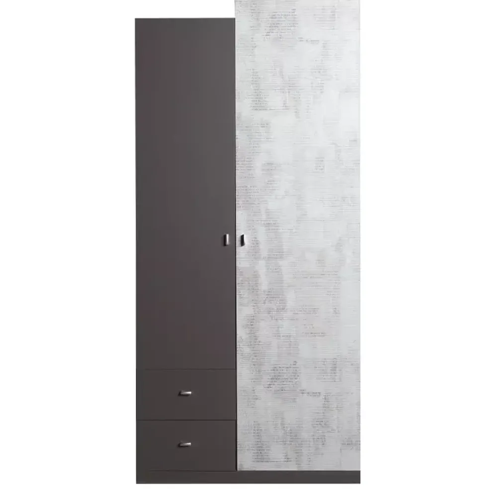 Szafa do pokoju młodzieżowego, wnętrze zaaranżowane w przestrzeń z szerokim wieszakiem, dwie mniejsze szuflady na bieliznę, po jednej ze stron znajduje się miejsce na dłuższe kurtki oraz płaszcze. Ponad wieszakiem umieszczono dwie półki oddzielone przegrodą. Bryła szafy ma nieregularny kształt, jeden z frontów jest minimalnie wyższy. Fronty w kontrastowych barwach grafitu oraz enigmy..