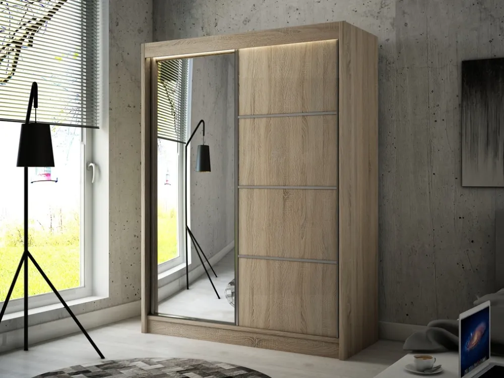 Zyskaj idealnie zorganizowaną przestrzeń dzięki szafie przesuwnej o szerokości 200 cm. Przemyślany układ wnętrza, liczne półki i dwa drążki na wieszaki pozwolą Ci łatwo uporządkować garderobę. Dodatkowe lustro na lewym froncie nie tylko ułatwia codzienne przygotowania, ale także optycznie powiększa wnętrze, nadając mu lekkości i elegancji.