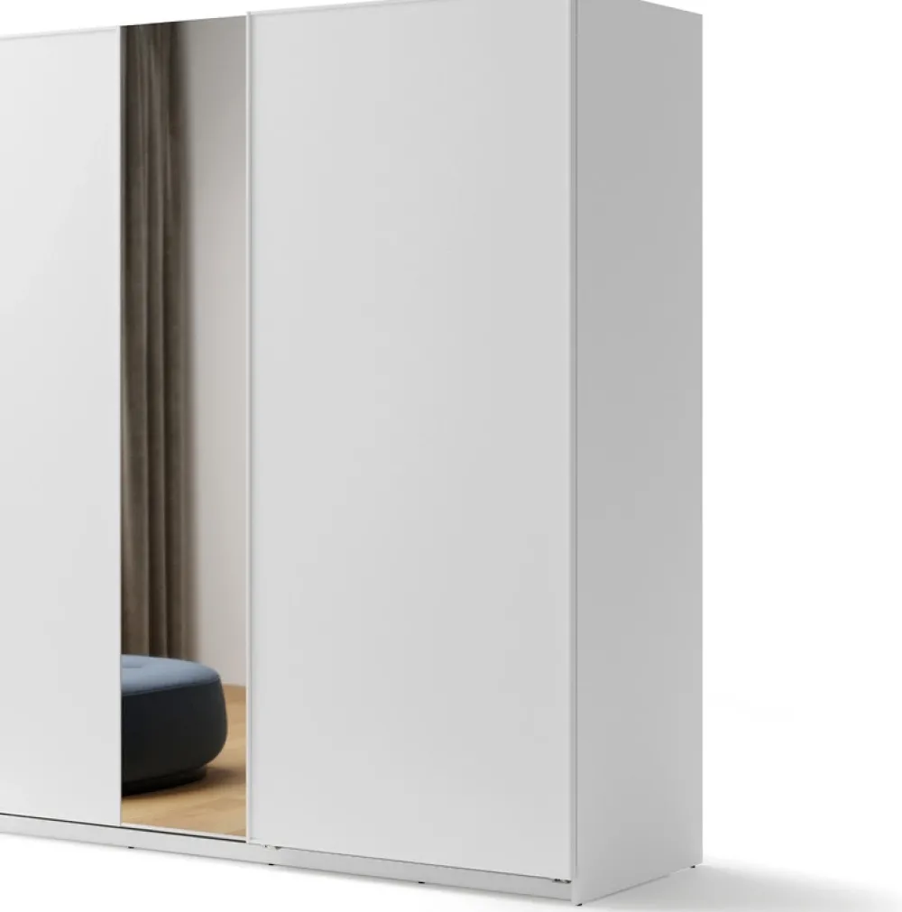 - Nowoczesna szafa przesuwna z lustrem MAXI o szerokości 200 cm wyposażona została w dwa drążki na ubrania i komplet półek. Na jednych z dwojga drzwi znajduje się lustro. Szafę można doposażyć w kontenerek, samodomykacze czy listwy z oświetleniem LED.