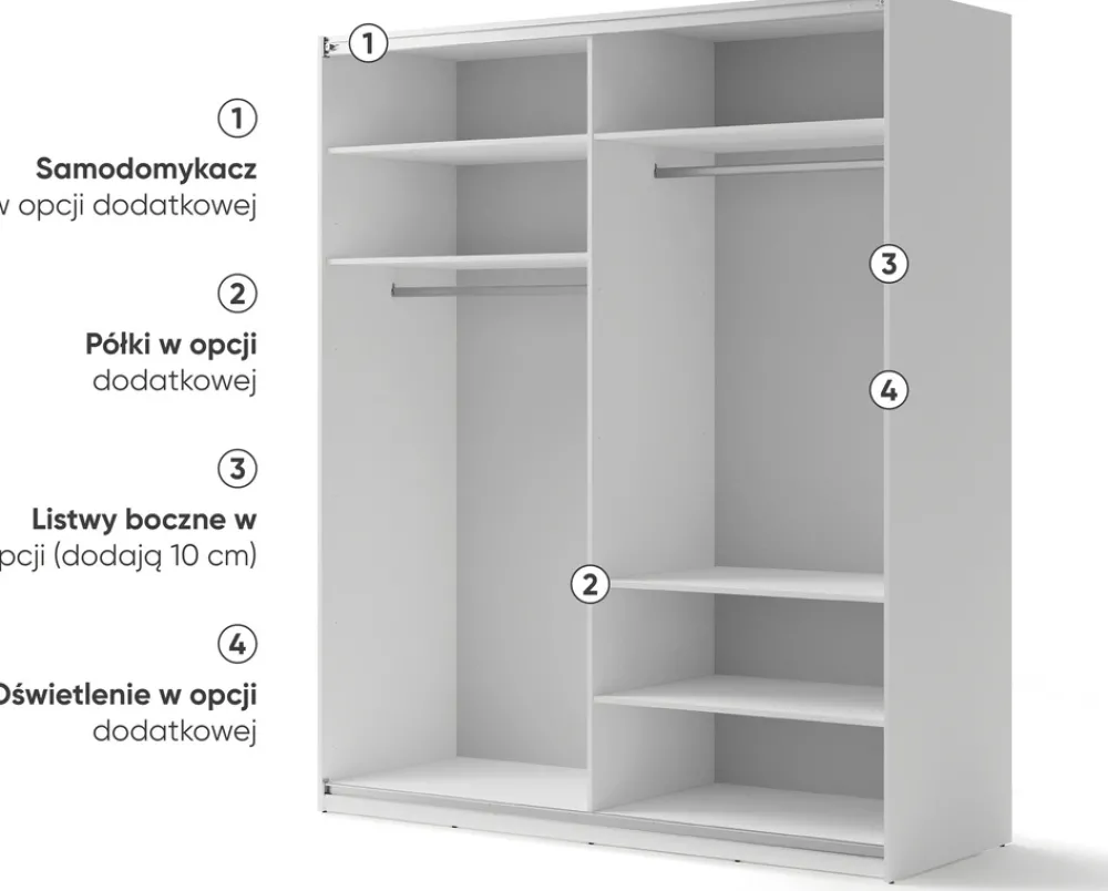 Dla osób poszukujących indywidualnych rozwiązań szafa przesuwna MAXI oferuje możliwość dopasowania wnętrza do własnych potrzeb. Można ją wyposażyć w dodatkowe akcesoria, takie jak samodomykacz do drzwi przesuwnych, który zapewni ciche i delikatne zamykanie, dodatkowe półki pozwalające na jeszcze lepsze zorganizowanie przestrzeni, czy kontenerek, który może służyć jako dodatkowe miejsce do przechowywania drobniejszych przedmiotów.