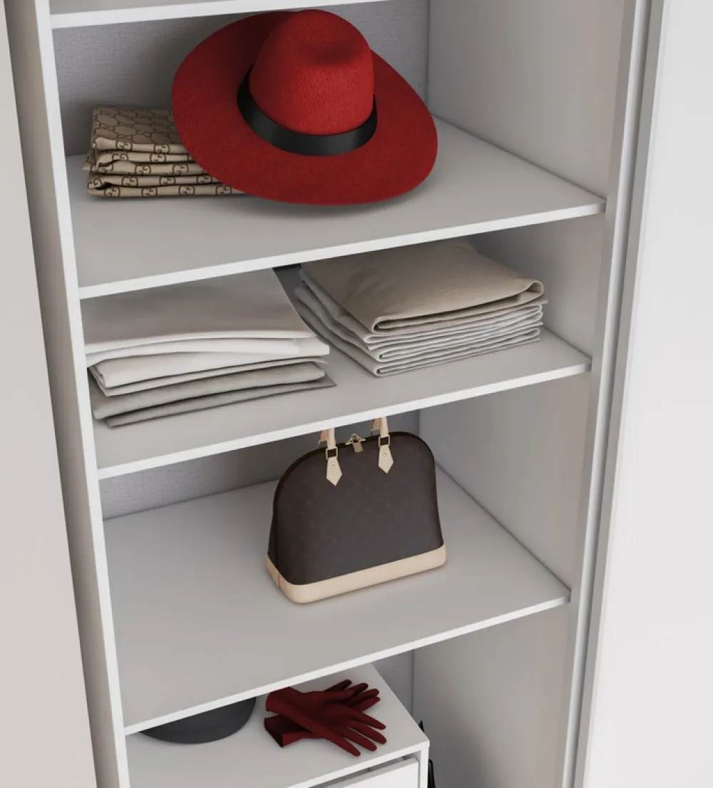- Dodatkowe półki do szafy przesuwnej MAXI umożliwiają lepsze zorganizowanie wnętrza, oferując dodatkowe miejsce na złożone ubrania, buty i akcesoria. Są wytrzymałe, łatwe w montażu i można je umieścić na różnych wysokościach, dostosowując szafę do swoich potrzeb.