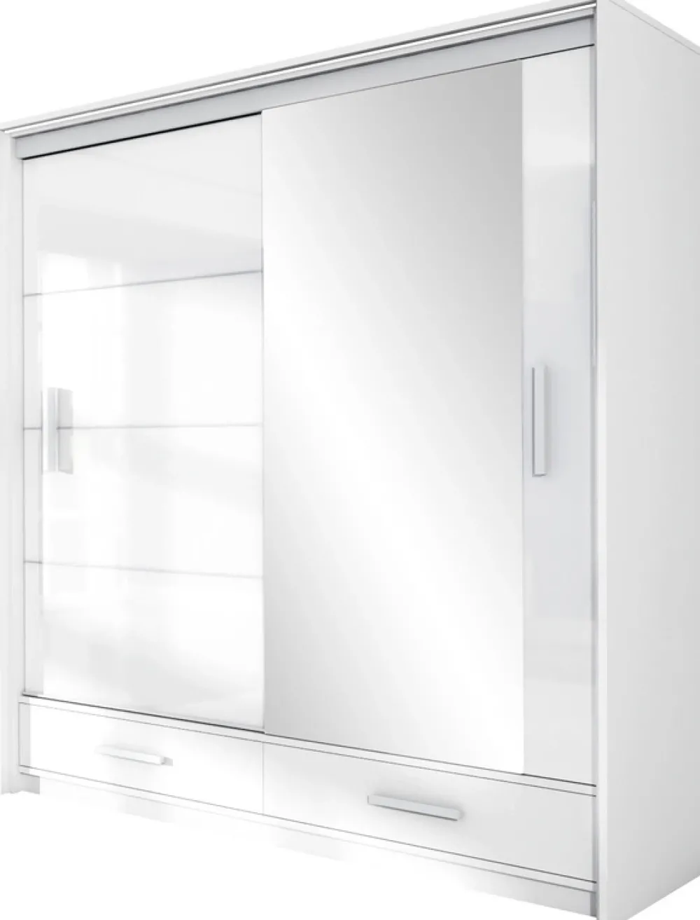 - Szafa przesuwna z lustrem MESTRE posiada 208 cm szerokości, w skład których wchodzą liczne półki oraz dwa aluminiowe drążki na wieszaki. U dołu szafy znajdują się dwie głębokie szuflady na bieliznę i akcesoria. Front szafy wykończony na wysoki połysk.