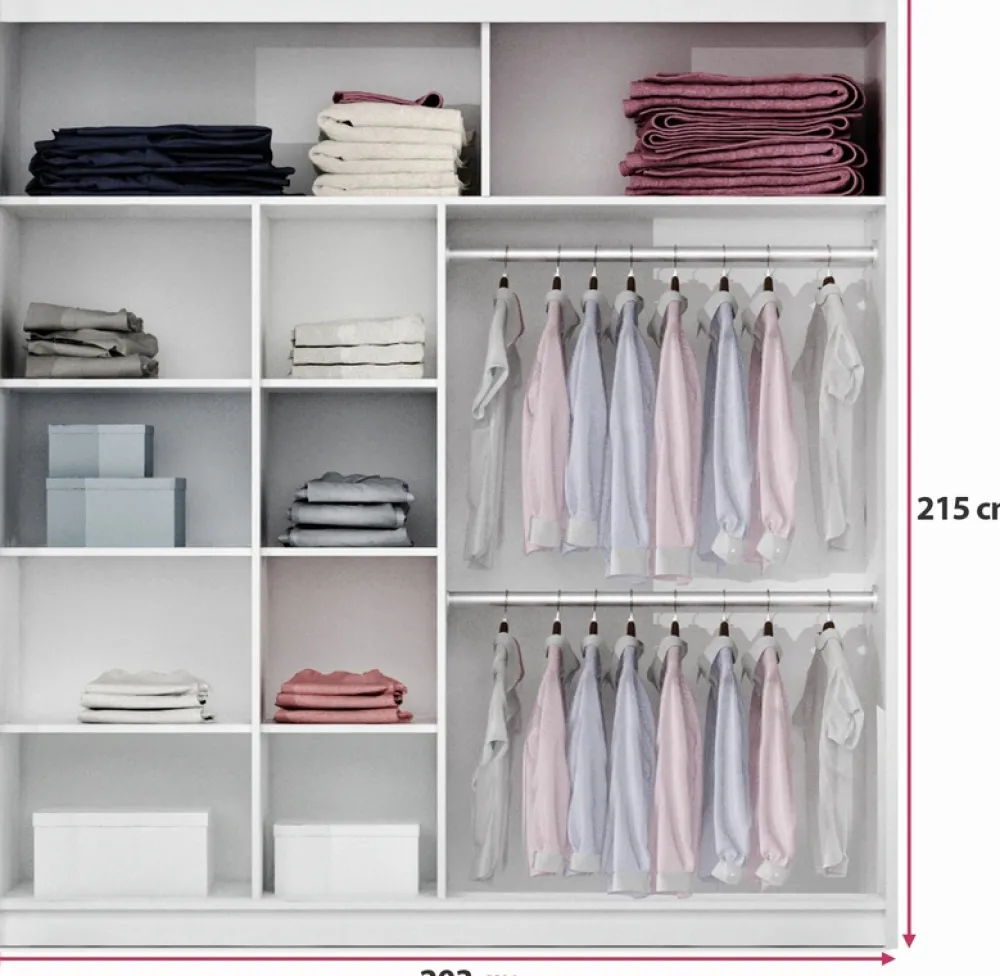 Szafa przesuwna o szerokości 203 cm to połączenie nowoczesnej estetyki i praktyczności. Jej przemyślany układ półek, drążków na wieszaki oraz lustrzanych drzwi sprawia, że jest to idealny wybór do każdej sypialni czy garderoby, oferując nie tylko funkcjonalność, ale również elegancję.