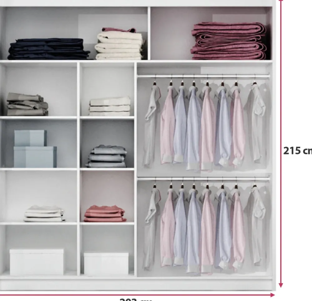 Szafa przesuwna z lustrem o szerokości 203 cm to idealne rozwiązanie dla osób ceniących styl, przestrzeń i wygodę. Przemyślany układ półek oraz drążków na wieszaki zapewnia maksymalną funkcjonalność, a eleganckie wykończenie nadaje wnętrzu nowoczesny charakter.