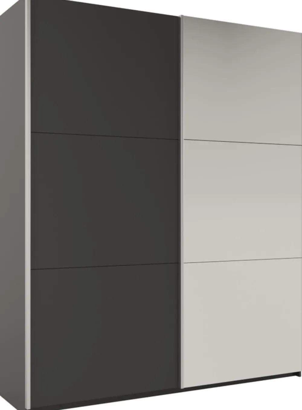 Szafa przesuwna z lustrem o szerokości 200 cm RUBIN to eleganckie i funkcjonalne rozwiązanie, które doskonale sprawdzi się w każdej sypialni lub garderobie. Dzięki drzwiom przesuwnym szafa nie tylko oszczędza przestrzeń, ale także zapewnia wygodny dostęp do wnętrza, co jest szczególnie praktyczne w mniejszych pomieszczeniach. Lustro umieszczone na prawych drzwiach optycznie powiększa pomieszczenie, wprowadzając do niego więcej światła i nadając mu nowoczesny charakter.