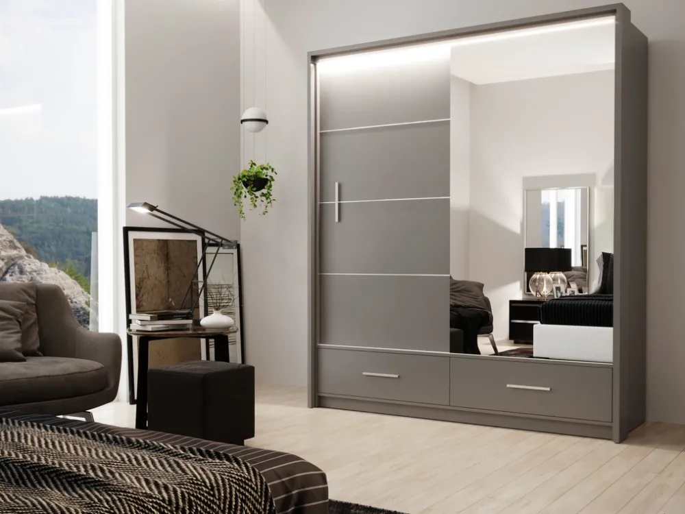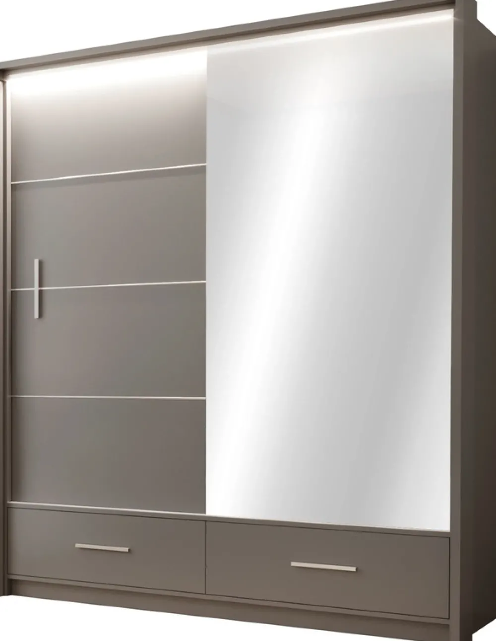 - Szafa przesuwna z lustrem MESTRE posiada 208 cm szerokości, w skład których wchodzą liczne półki oraz dwa aluminiowe drążki na wieszaki. U dołu szafy znajdują się dwie głębokie szuflady na bieliznę i akcesoria.