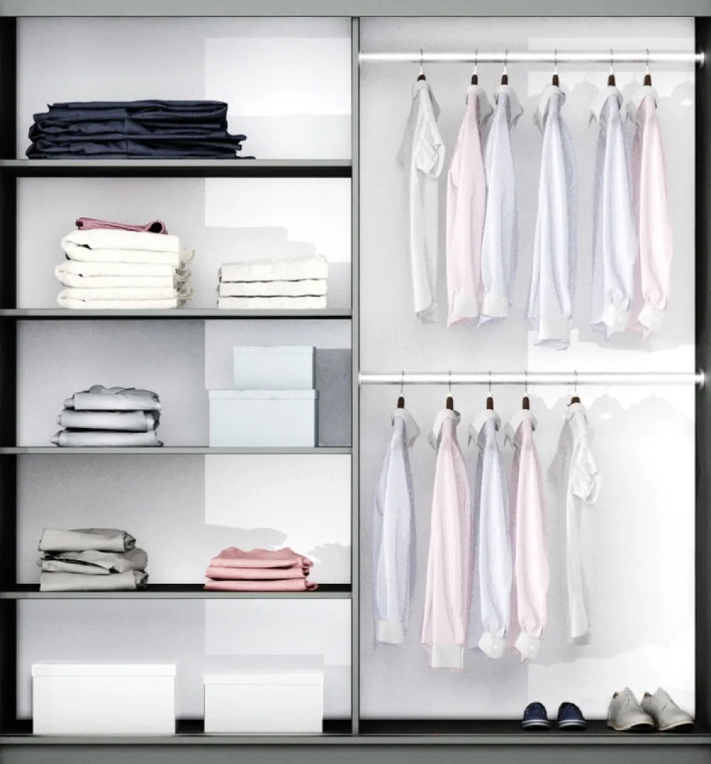 - Drzwi szafy zostały osadzone na łożyskowanym, aluminiowym systemie przesuwnym.