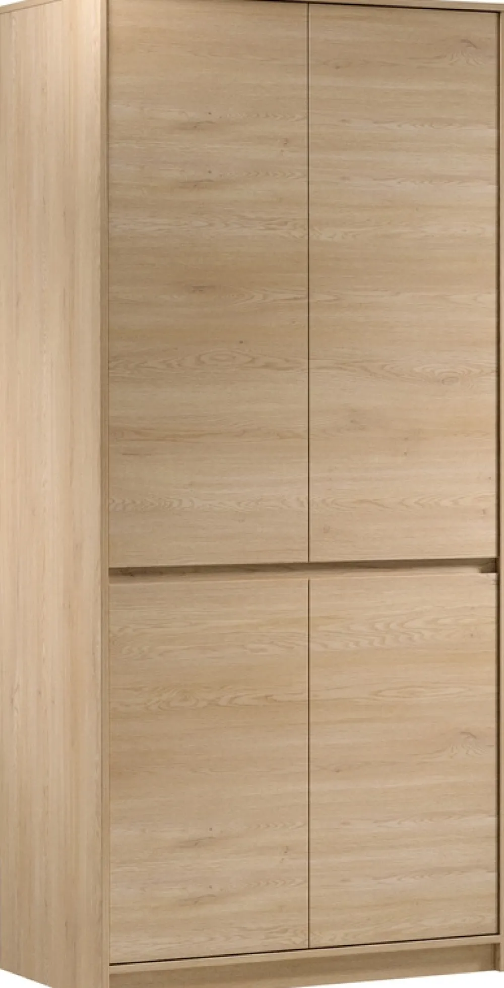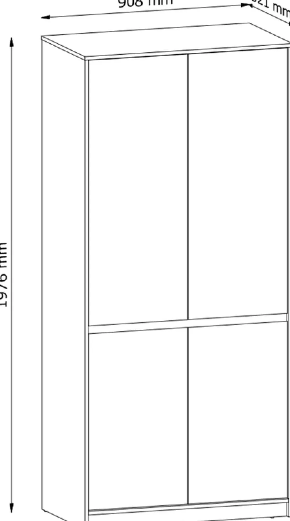 - Szafa posiada cztery drzwi. Za drzwiami znajduje się drążek na wieszaki w górnej części mebla oraz dwie przestronne półki w dolnej części.