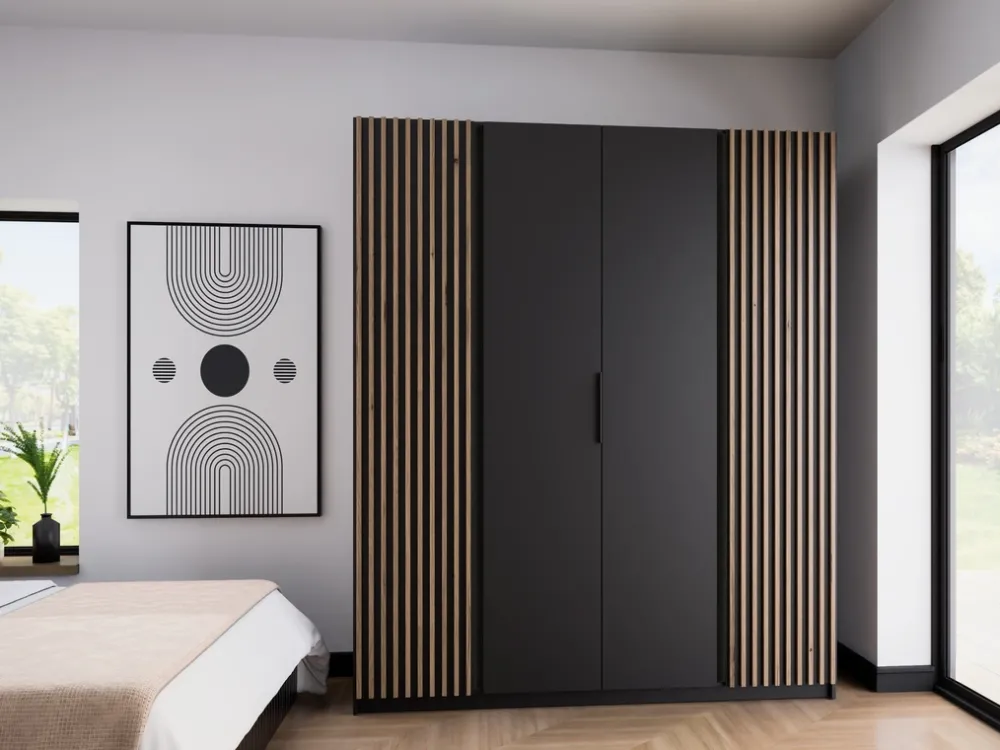 Korpus oraz front szafy z lamelami wykonano z wysokiej jakości płyty laminowanej o grubości 16 mm. Ten solidny materiał zapewnia trwałość i odporność na uszkodzenia, co gwarantuje długie lata użytkowania. Boczne drzwi szafy zdobią eleganckie lamele, które nadają meblowi unikalny i stylowy wygląd, wyróżniając go na tle innych szaf.