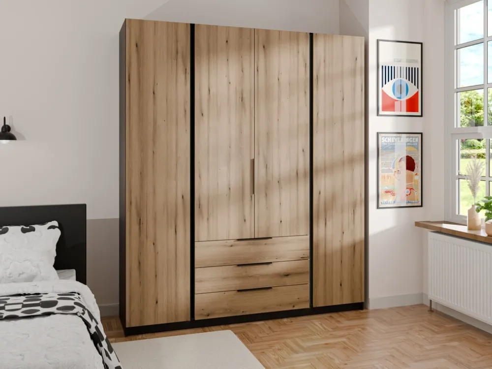 Szafa posiada cztery drzwi, osadzone na trwałych zawiasach puszkowych, które gwarantują ciche i płynne zamykanie. Jest to wyjątkowo praktyczne rozwiązanie, które docenią zwłaszcza osoby, ceniące sobie spokój i ciszę w domowym zaciszu.