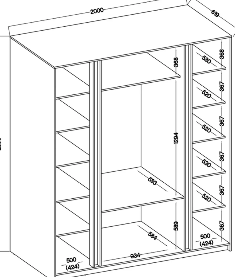 - Nowoczesna szafa uchylna 200 cm KARAT posiada trzy szuflady oraz pięć półek za prawymi oraz lewymi drzwiami. W centralnej części znajduje się półka, a pod nią aluminiowy drążek na wieszaki. Uchwyty zostały wykonane w czarnym kolorze z aluminium.