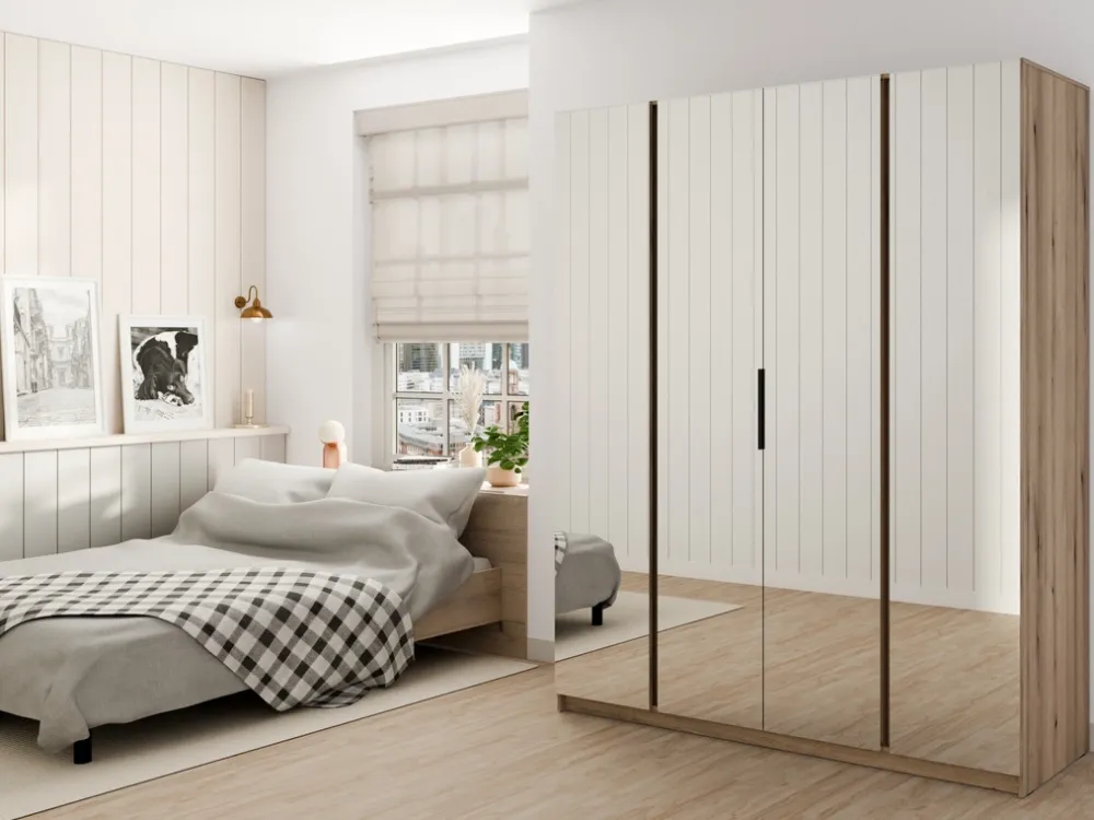 Korpus oraz front szafy do sypialni wykonano z wysokiej jakości płyty laminowanej o grubości 16 mm. Materiał ten zapewnia trwałość i solidność konstrukcji, co jest niezwykle istotne w przypadku dużych mebli. Unikalnym elementem tej szafy są lustra umieszczone na każdych drzwiach, które nie tylko pełnią funkcję praktyczną, umożliwiając wygodne przeglądanie się, ale także optycznie powiększają przestrzeń, wprowadzając więcej światła i świeżości do sypialni.