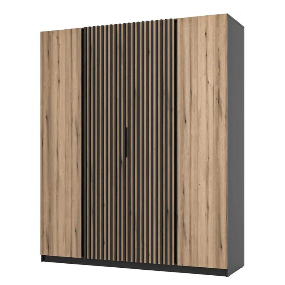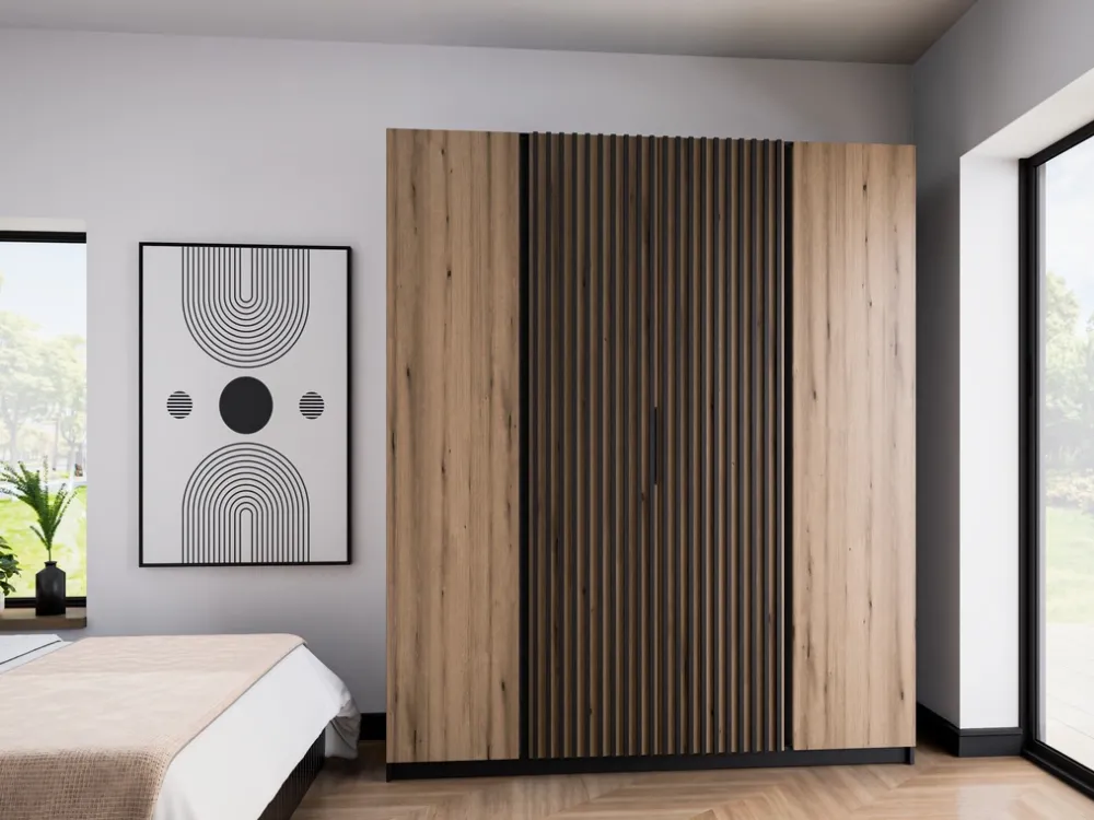 Korpus oraz front szafy do sypialni z lamelami wykonano z wysokiej jakości płyty laminowanej o grubości 16 mm, co gwarantuje trwałość i solidność konstrukcji. Wyjątkowym akcentem są dwa środkowe drzwi z lamelami, które nadają szafie nowoczesny i stylowy charakter, przyciągając wzrok i wprowadzając do wnętrza unikalny element dekoracyjny.