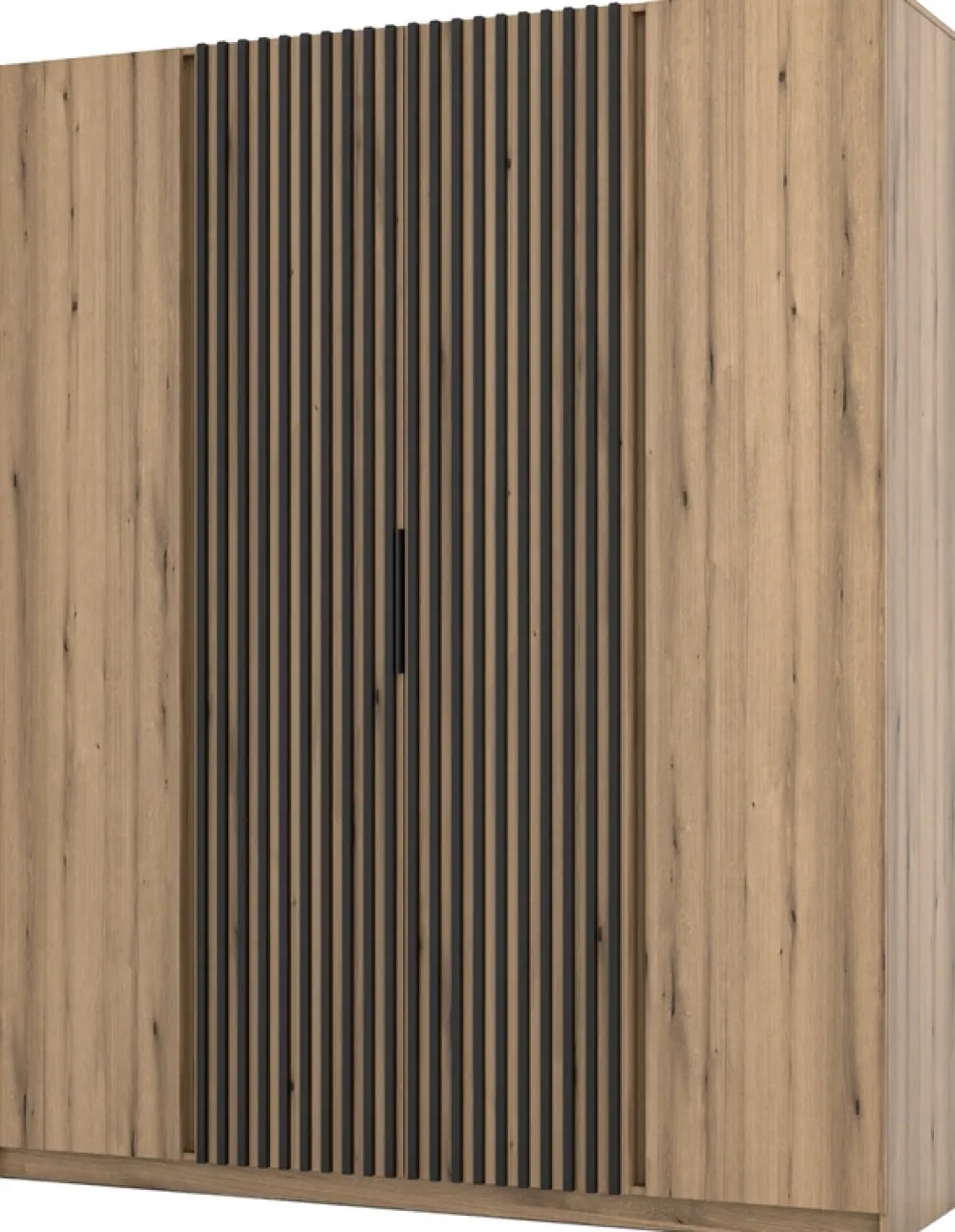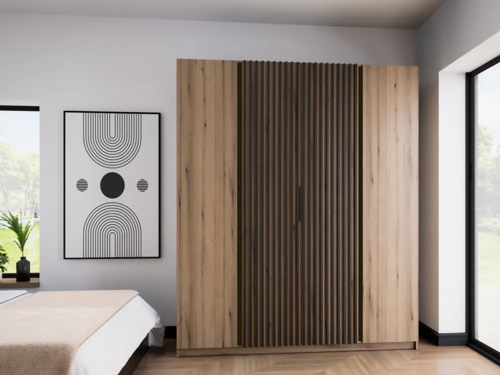 Korpus oraz front szafy wykonano z płyty laminowanej o grubości 16 mm, co zapewnia jej wyjątkową trwałość i solidność. Dwa środkowe drzwi szafy do sypialni zostały ozdobione lamelami, które nadają meblowi unikalny i stylowy wygląd, wyróżniając go na tle innych szaf.