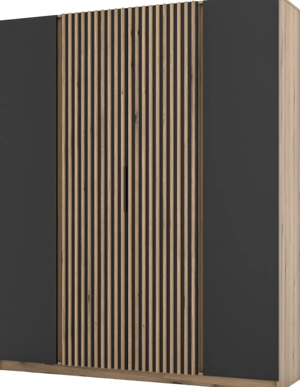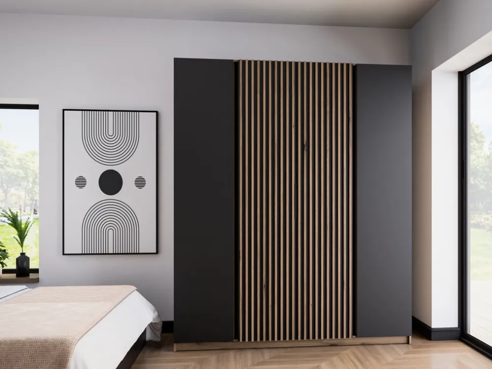 Korpus oraz front szafy z lamelami wykonano z wysokiej jakości płyty laminowanej o grubości 16 mm, co gwarantuje trwałość i solidność. Unikalnym elementem są dwa środkowe drzwi z lamelami, które nadają meblowi nowoczesny i stylowy charakter, wyróżniając się na tle innych szaf.