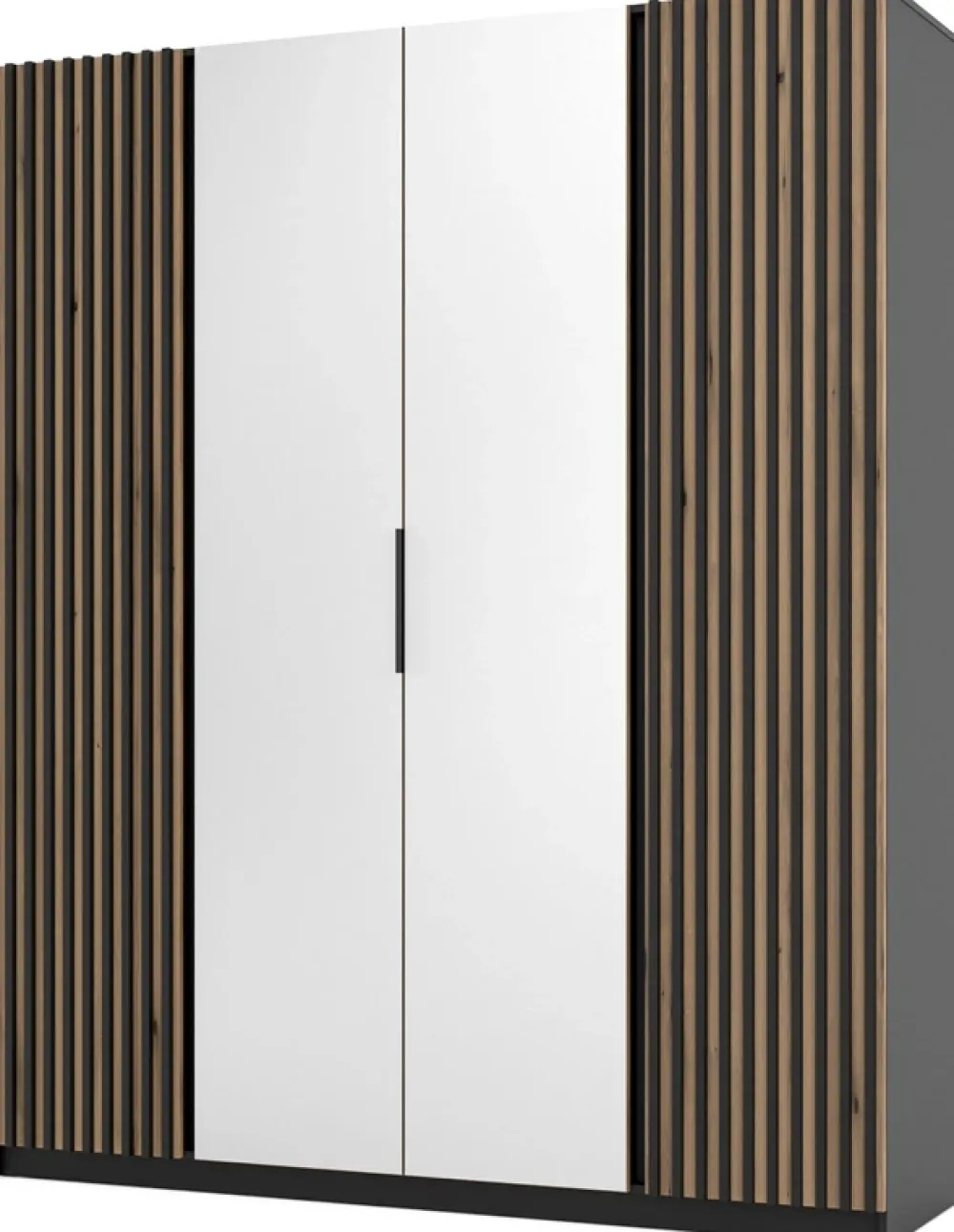 - Szafa czterodrzwiowa do sypialni KARAT. Sześć półek po bokach, półka i drążek centralnie, boczne drzwi z lamelami. Melamina, okleina ABS, czarne aluminiowe uchwyty, zawiasy puszkowe. Szafa wykonana z płyty laminowanej 16 mm.