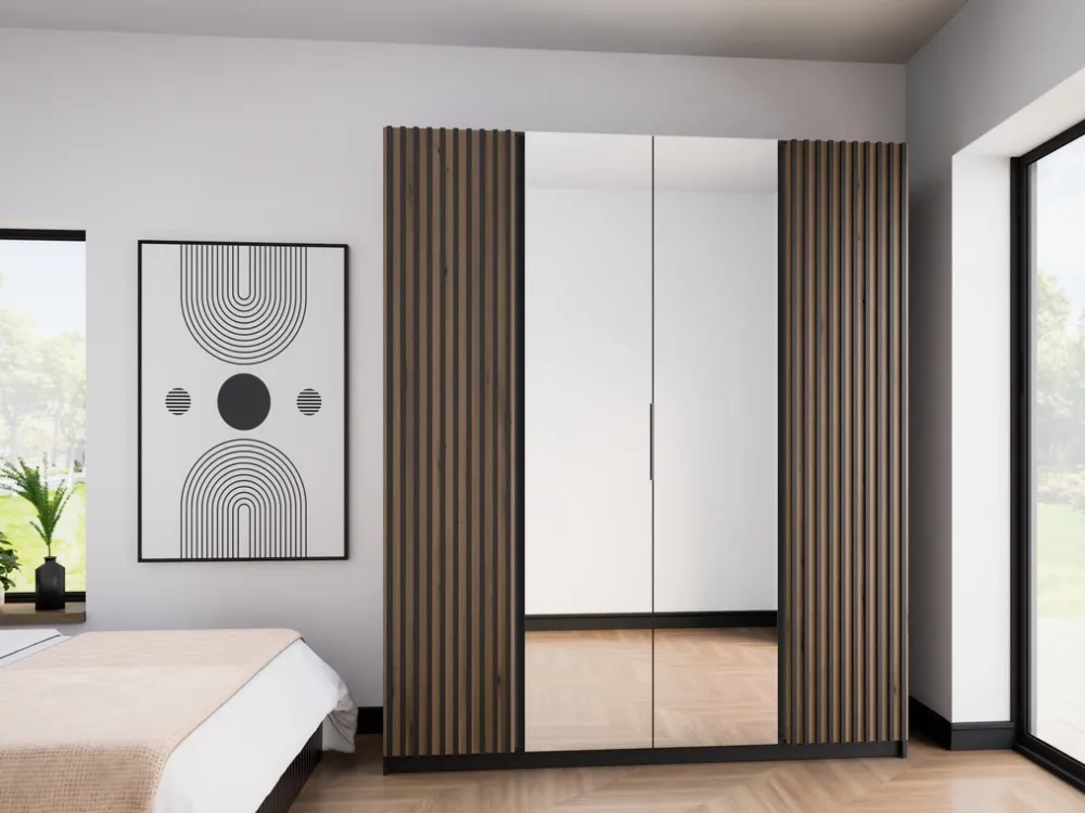 Szafa do sypialni z lamelami wykonana jest z wysokiej jakości płyty laminowanej o grubości 16 mm, co zapewnia jej trwałość i solidność. Korpus oraz front szafy charakteryzują się wyjątkową odpornością na uszkodzenia mechaniczne, co gwarantuje długowieczność mebla. Boczne drzwi szafy są ozdobione lamelami, które dodają jej elegancji i unikalnego charakteru.