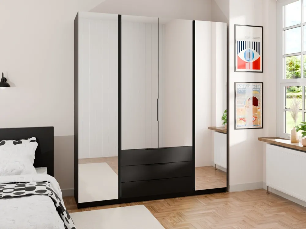 - Szafa z lustrem 200 cm KARAT posiada trzy głębokie szuflady oraz cztery drzwi w formie luster które optycznie powiększają oraz rozjaśniają pomieszczenie. Szafa została wykonana z płyty laminowanej 16 mm, uchwyty wykonano w czarnym kolorze z aluminium.