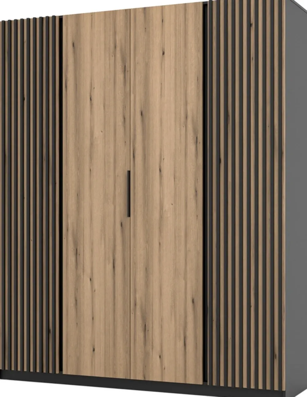 Szafa czterodrzwiowa z lamelami do sypialni KARAT to wyjątkowe połączenie elegancji i funkcjonalności, które sprawdzi się w każdej nowoczesnej sypialni. Dzięki przemyślanemu projektowi i wysokiej jakości wykonaniu, szafa ta stanowi idealne rozwiązanie dla osób ceniących sobie zarówno estetykę, jak i praktyczność.