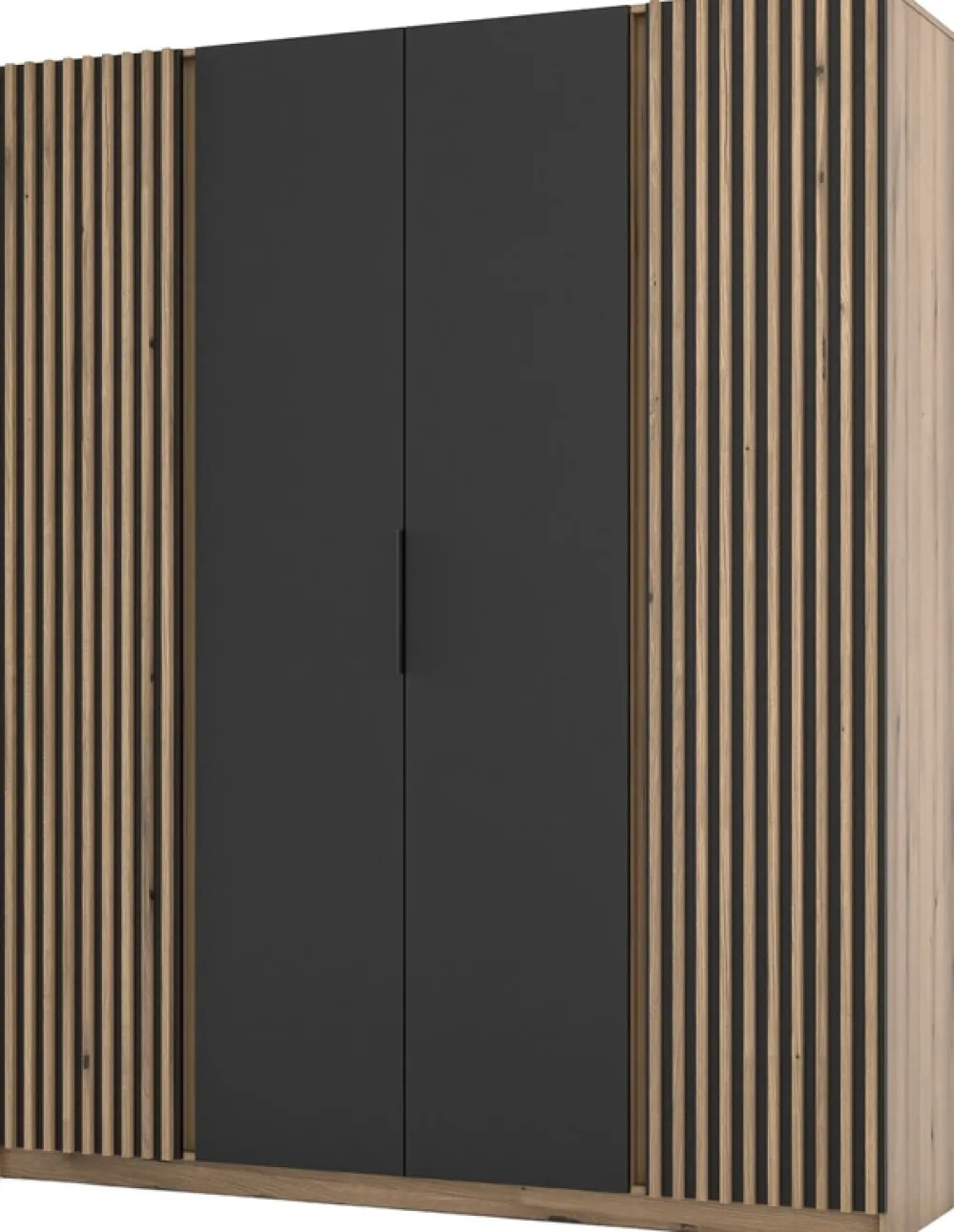 - Szafa czterodrzwiowa do sypialni KARAT – elegancja i funkcjonalność. Płyta laminowana 16 mm, sześć półek po bokach, półka i drążek centralnie. Melamina, okleina ABS, lamelowane boczne drzwi, czarne aluminiowe uchwyty, zawiasy puszkowe.