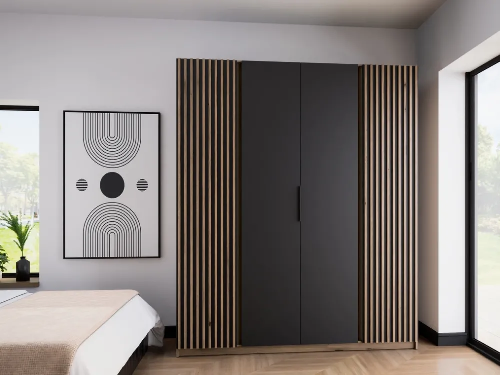 Korpus oraz front szafy z lamelami do sypialni wykonano z wysokiej jakości płyty laminowanej o grubości 16 mm, co gwarantuje trwałość i solidność konstrukcji. Boczne drzwi szafy zostały ozdobione nowoczesnymi lamelami, które nadają meblowi wyjątkowy wygląd i wprowadzają do sypialni elementy nowoczesnego designu.