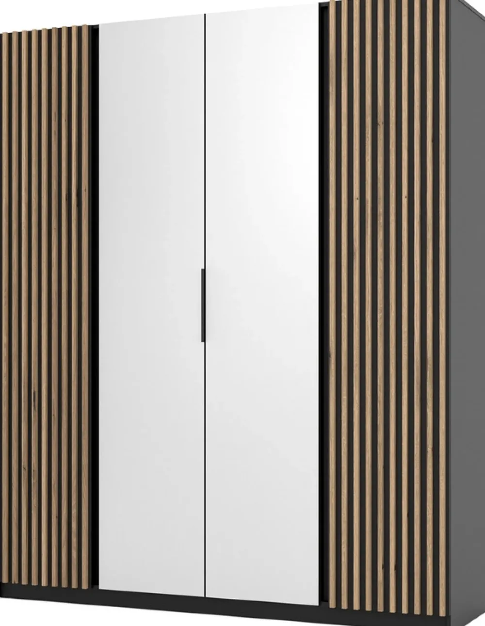 Korpus oraz front szafy KARAT wykonano z wysokiej jakości płyty laminowanej o grubości 16 mm, co zapewnia trwałość i solidność konstrukcji. Charakterystycznym elementem są boczne drzwi z lamelami, które dodają szafie wyjątkowego stylu i podkreślają jej nowoczesny design.